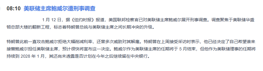 Les dernières nouvelles indiquent que le président de la Réserve fédérale, Powell, est actuellement enquêté pénalement par le procureur fédéral, le point central étant le projet de rénovation de son siège social. Bien que cela semble être un simple problème de construction, il s'agit en réalité de la mise en lumière et de la judiciarisation de la longue et vive confrontation entre Trump et Powell !