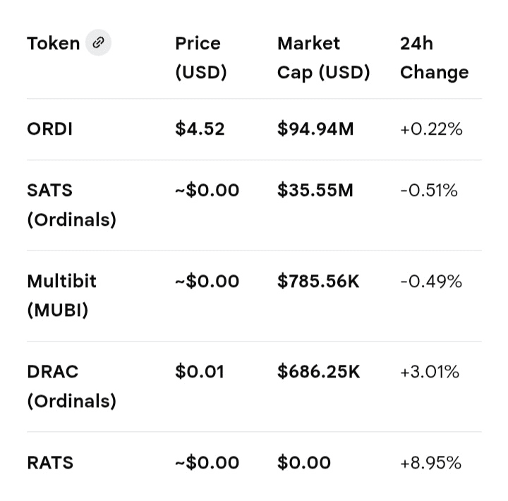 L'écosystème des jetons BRC-20 sur la blockchain Bitcoin est dirigé par ORDI, qui a la plus grande capitalisation boursière. D'autres jetons populaires incluent SATS et RATS.