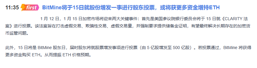 Aujourd'hui, beaucoup de gens ont ignoré un événement important du 15 : la société BitMine va voter sur la possibilité d'augmenter considérablement son capital-actions. Si cela est approuvé, elle obtiendra une grande quantité de fonds et a clairement indiqué qu'elle voulait augmenter ses positions en ETH.