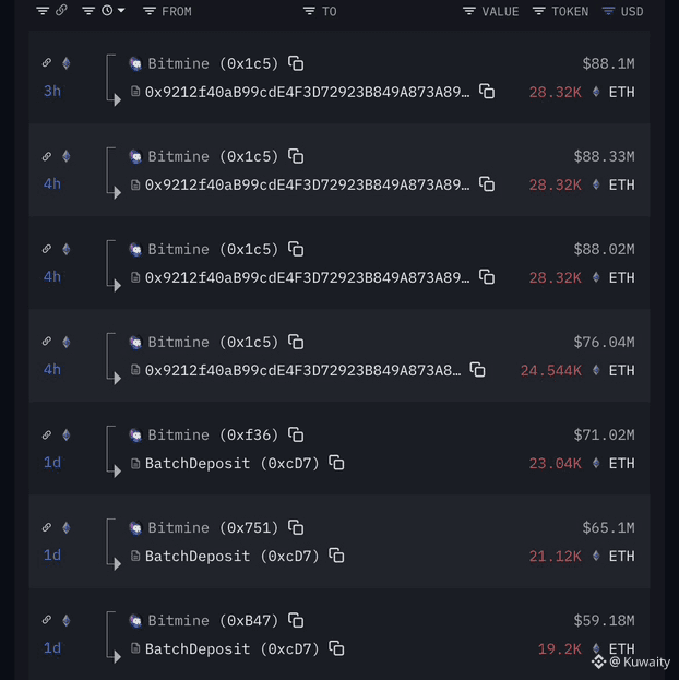يواصل تخزين $ETH جذب رؤوس أموال مؤسسية قوية مع تزايد الثقة في النمو طويل الأجل للشبكة. وقد اتخذت شركة Bitmine، المدعومة من الاستراتيجي المعروف في الأسواق توم لي، خطوة حاسمة جديدة بإضافة 109,504 عملة ETH إلى محفظة التخزين الخاصة بها خلال أربع ساعات فقط. وتُقدّر قيمة هذه الإضافة الأخيرة بنحو 340.6 مليون دولار، ما يعزز التزام Bitmine المتزايد بتخزين إيثريوم.