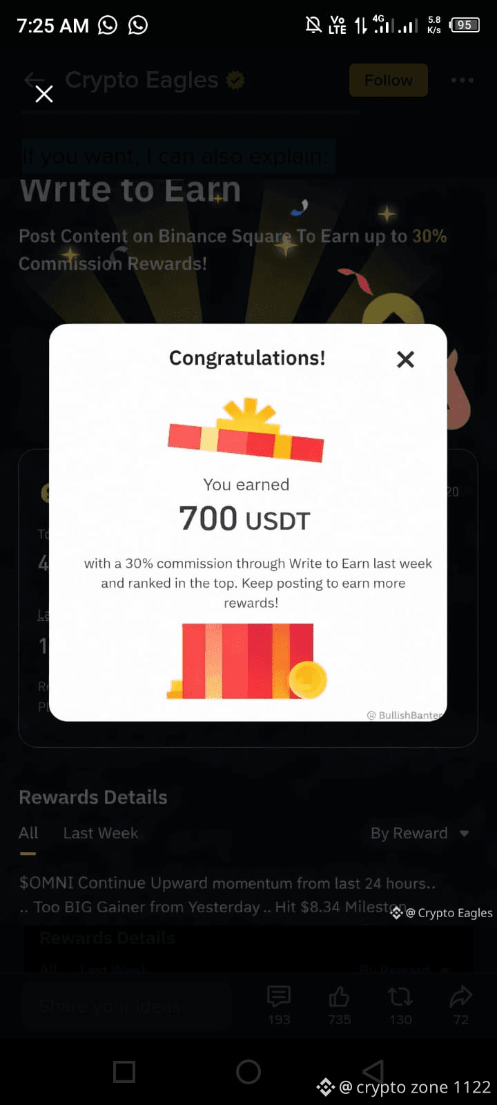 $4 reward for everyone in the first pinned post. Enter the account and congratulations! 👌 Oh… from $0 → $100 within 24 hours