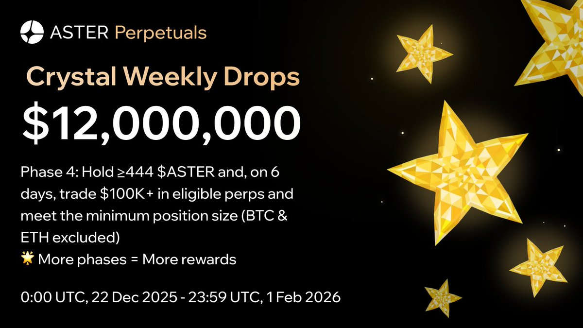 🌟 La bataille entre les DEXs devient de plus en plus intense. Et Aster fait preuve de sa puissance à travers l'événement Crystal Weekly Drops – un programme qui fait sensation sur Aster DEX. Avec la Phase 4 lancée récemment du 12 au 18/1/2026, ce n'est pas un simple événement de récompense par « farming », mais une démarche stratégique intelligente d'Aster. Découvrons ensemble les objectifs et les résultats atteints par Aster ci-dessous !