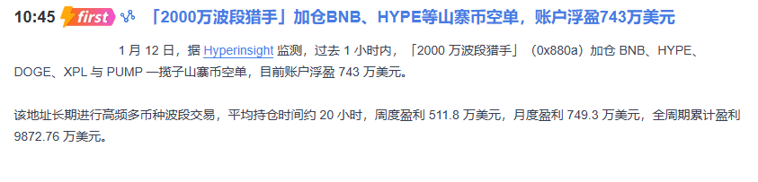 La surveillance indique que l'adresse de gros joueur « chasseur de cycles de 20 millions » a fortement augmenté ses positions à découvert sur plusieurs actifs, y compris le BNB, au cours de la dernière heure, avec un bénéfice flottant atteignant 7,43 millions de dollars américains. Ce qui est encore plus inquiétant, c'est son bilan : 5,11 millions de dollars gagnés en une semaine, 7,49 millions en un mois, avec un profit total proche de 100 millions de dollars américains. Il s'agit d'un joueur institutionnel typique, agressif et à haute fréquence.