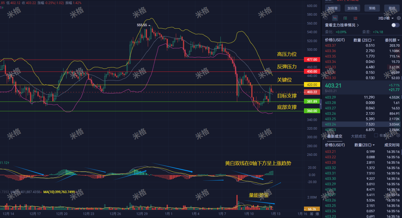 Mig estime que ZEC aura du mal à franchir et à tenir fermement le niveau 450 aujourd'hui, et la tendance probable sera la suivante : en journée, il pourrait s'élever rapidement vers la zone 445-450 grâce à des nouvelles, puis subir une pression à la baisse, avant de revenir vers la zone 380-390 en soirée pour chercher un soutien.