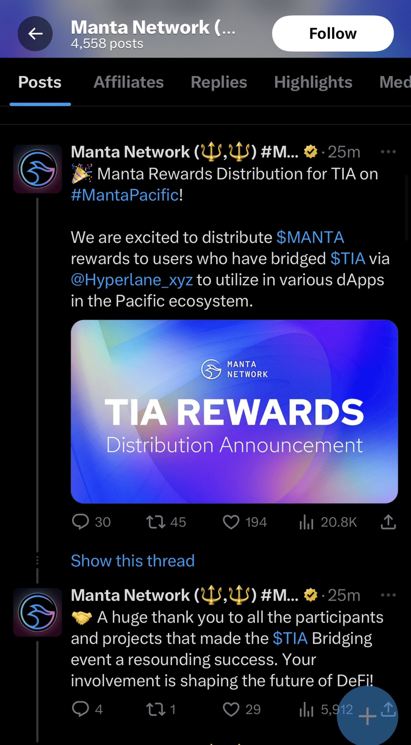 L'annonce récente de largage aérien par Manta a suscité des inquiétudes au sein de la communauté Celestial. L'obligation de faire passer $TIA par le protocole Hyperliquid exclut les stakers dédiés, que beaucoup considèrent comme l'épine dorsale du projet.