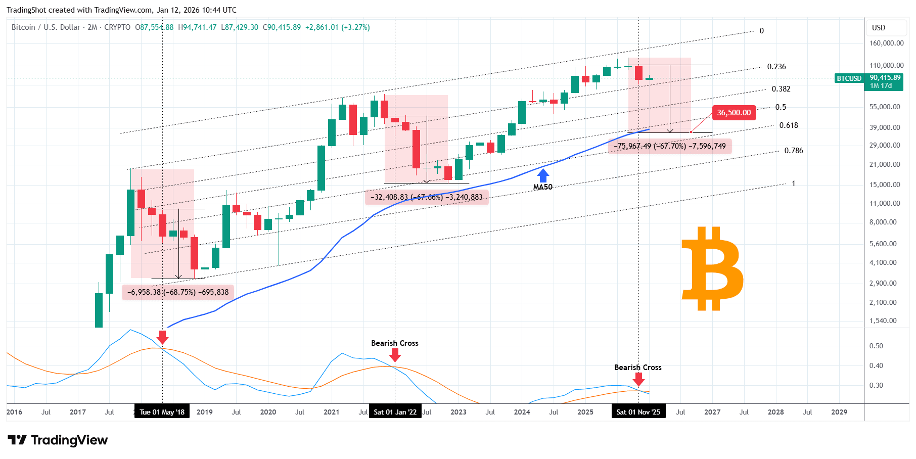 Bitcoin (BTCUSD) a clôturé la dernière bougie de 2M sur une croisement baissier MACD. À chaque fois que cela s'est produit dans le passé (2 fois), le Bitcoin a chuté de -67,66 % et -68,75 % depuis le sommet de cette bougie.