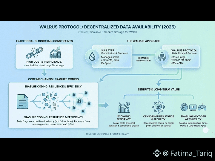 Jab maine pehli dafa 2025 ke shuru mein Walrus Protocol ke baare mein suna, to honestly thori si ehtiyaat thi. Itne saalon se trading aur crypto infrastructure projects ko follow karte hue aadat ho jati hai ke har naya project khud ko “next big thing” kehta hai. Har koi scalability aur low cost ka claim karta hai. Lekin jaise jaise maine Walrus aur uske Sui ecosystem ke saath integration ko samjha, mujhe laga ke yeh project actually ek real problem ko address kar raha hai. Walrus ka focus sirf ek cheez par hai: decentralized environment mein large data ko efficiently store aur serve karna.Walrus asal mein Sui blockchain par bana hua ek decentralized data storage aur data availability layer hai. Yeh point bohat important hai. Walrus ne apni khud ki chain launch karne ke bajaye Sui ko coordination layer ke taur par use kiya hai. Sui payments, smart contracts aur data lifecycle manage karta hai, jabke Walrus ka kaam large files, yaani blobs, ko store aur move karna hai. Trader ke nazariye se dekha jaye to yeh approach kaafi sensible lagti hai. Existing high-performance blockchain ka use karna complexity ko kam karta hai aur adoption ke chances barhata hai.Blob storage ka concept simple hai agar aap technical terms ko side par rakh dein. Blockchains directly large files store karne ke liye nahi banaye gaye, kyun ke yeh mehnga aur inefficient hota hai. Walrus allow karta hai ke applications apna heavy data off-chain store karein, lekin phir bhi cryptographic guarantees ke saath. Yeh blobs kisi bhi type ke ho sakte hain, jaise application data, media files, AI datasets, ya historical records. Blockchain data ka weight uthata nahi, lekin us data ki location aur verification ko track karta hai.Walrus ko dusre storage projects se alag jo cheez karti hai woh hai erasure coding ka use. Agar aap technical nahi hain, to isay aise samjhein: traditional systems ek hi file ko kai martaba copy kar dete hain taake data loss na ho. Yeh secure to hota hai, lekin bohat zyada storage waste karta hai. Walrus iske bajaye data ko chhote pieces mein tod deta hai aur mathematical redundancy add karta hai. Iska matlab yeh ke agar kuch pieces missing bhi ho jayein, tab bhi original data recover kiya ja sakta hai. Aapko har piece ki zarurat nahi hoti, bas enough pieces hon.Iska direct faida cost aur scalability par parta hai. Walrus ko ek hi data ke liye bohat saari full copies store nahi karni partiin. Protocol ke design ke mutabiq, total storage overhead takriban original data se paanch guna hota hai, jo ke kaafi efficient mana jata hai. Investor ke liye yeh point bohat relevant hai, kyun ke lower storage cost ka matlab zyada users aur zyada real adoption hota hai. Aur jahan adoption hoti hai, wahan long-term value create hoti hai.