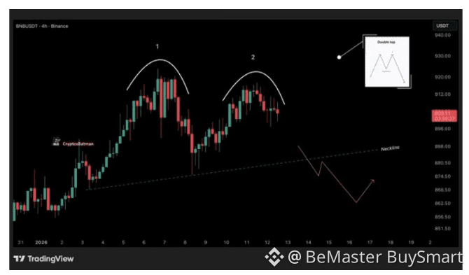 $BNB is developing a double top formation on the 4-hour chart near the $900 level, suggesting potential short-term downside, though the broader uptrend remains firmly in place.