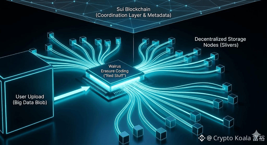 O Walrus foi projetado para lidar com um tipo específico de dado: arquivos grandes, estáveis e que precisam continuar disponíveis por longos períodos. Vídeos, imagens, bases de dados, arquivos históricos e dados utilizados por aplicações descentralizadas. Em vez de tratar armazenamento como um serviço simples, o protocolo trata armazenamento como uma operação contínua, que envolve fragmentação, distribuição, verificação e manutenção ao longo do tempo. Internamente, o processo começa quando um arquivo é transformado em um conjunto de fragmentos criptograficamente verificáveis. Nenhum fragmento sozinho representa o dado completo, mas o conjunto mínimo deles permite a reconstrução perfeita do conteúdo original.