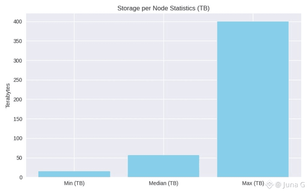 Scalability isn’t marketed as a vibe; it’s treated as an operational parameter. Walrus is engineered to scale horizontally to hundreds or thousands of storage nodes, and it’s already been evaluated in a decentralized testbed: 105 independently operated storage nodes coordinating 1,000 shards, with nodes spanning at least 17 countries. In that environment, shard allocation is stake-weighted (mirroring the mainnet deployment model), and the paper reports storage per node ranging from 15 to 400 TB, with a median of 56.9 TB. When you combine that distribution with erasure coding, you get a storage fabric that doesn’t depend on “a few big hosts” behaving; it becomes an ecosystem.