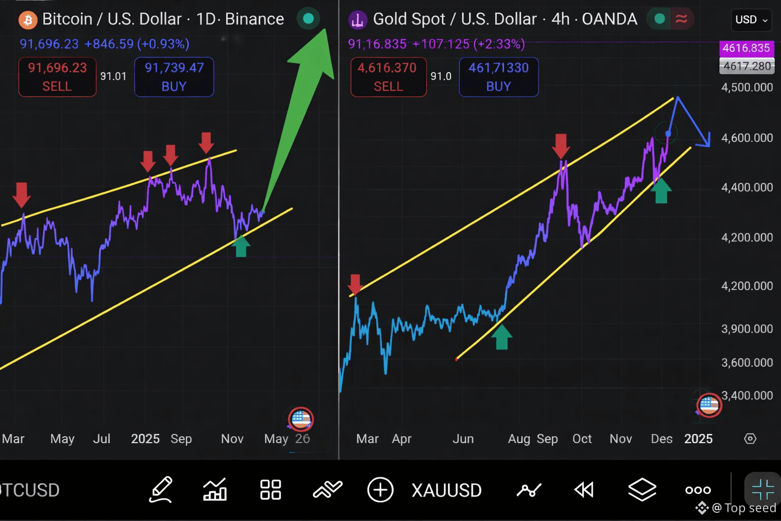 Both #BTCUSDT. D (Daily) and #XAUUSD USD (4H) are trading within well-defined ascending channels, a strong indication that bullish market structure remains intact despite short-term volatility.