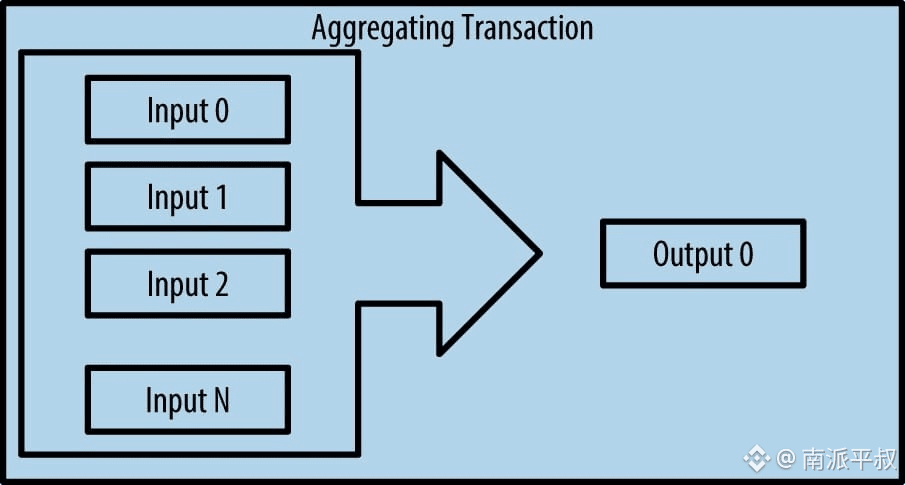 另一种常见的交易形式是集合多个输入到一个输出(如图2-6)的模式。这相当于现实生活中将很多硬币和纸币零钱兑换为一个大额面钞。像这样的交易有时由钱包应用产生来清理许多在支付过程收到的小数额的找零。