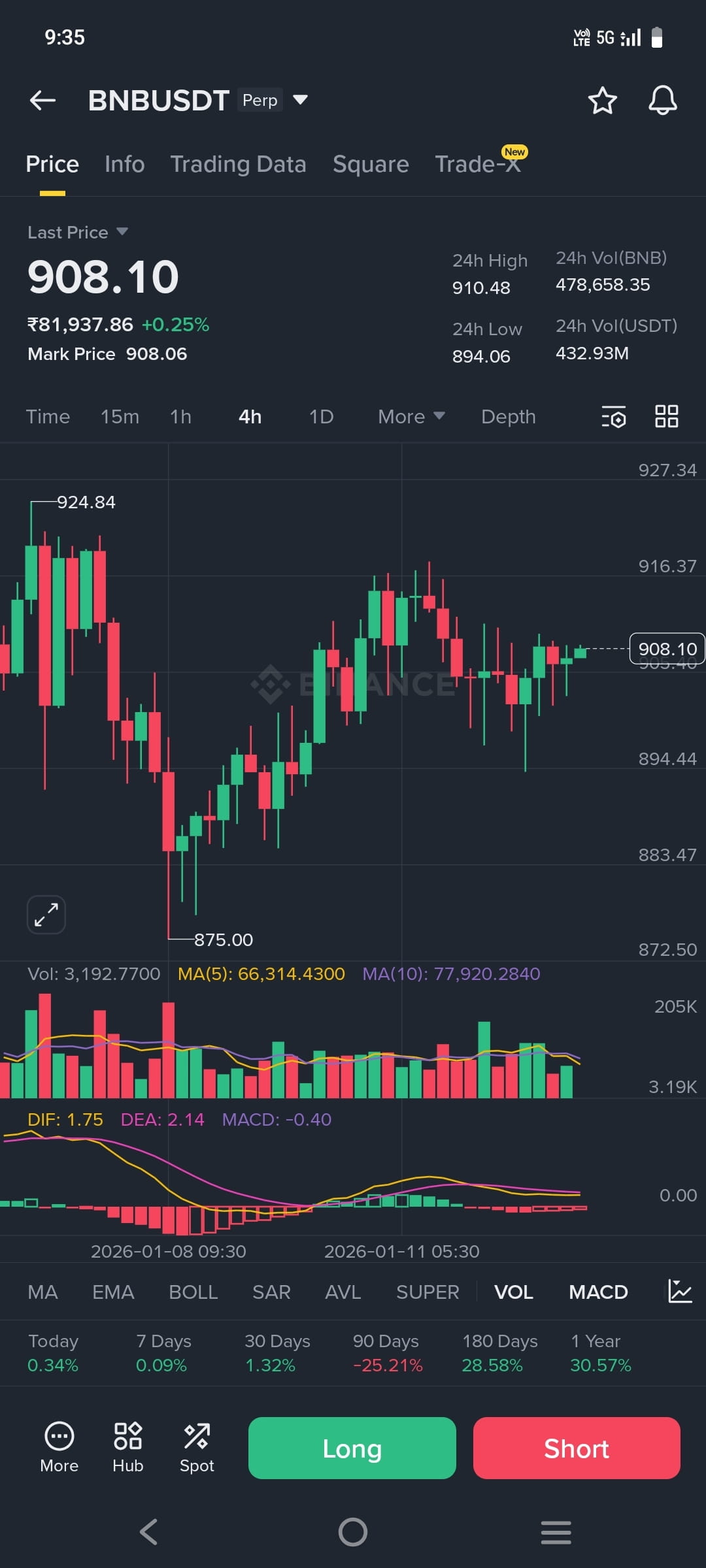 Le BNB est actuellement négocié autour de 908 $, et des niveaux très intéressants apparaissent sur le graphique. La récupération à partir de 875 $ sur le graphique 4H indique que les acheteurs (bulls) sont toujours présents.