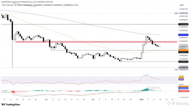 على الجانب الآخر، قد يؤدي الانعكاس المحتمل في PEPE إذا ارتدت دوجكوين وشيبا إينو إلى اختبار منطقة العرض عند 0.00000650 دولار، يليه المتوسط المتحرك الأسي لمدة 200 يوم عند 0.00000738 دولار.