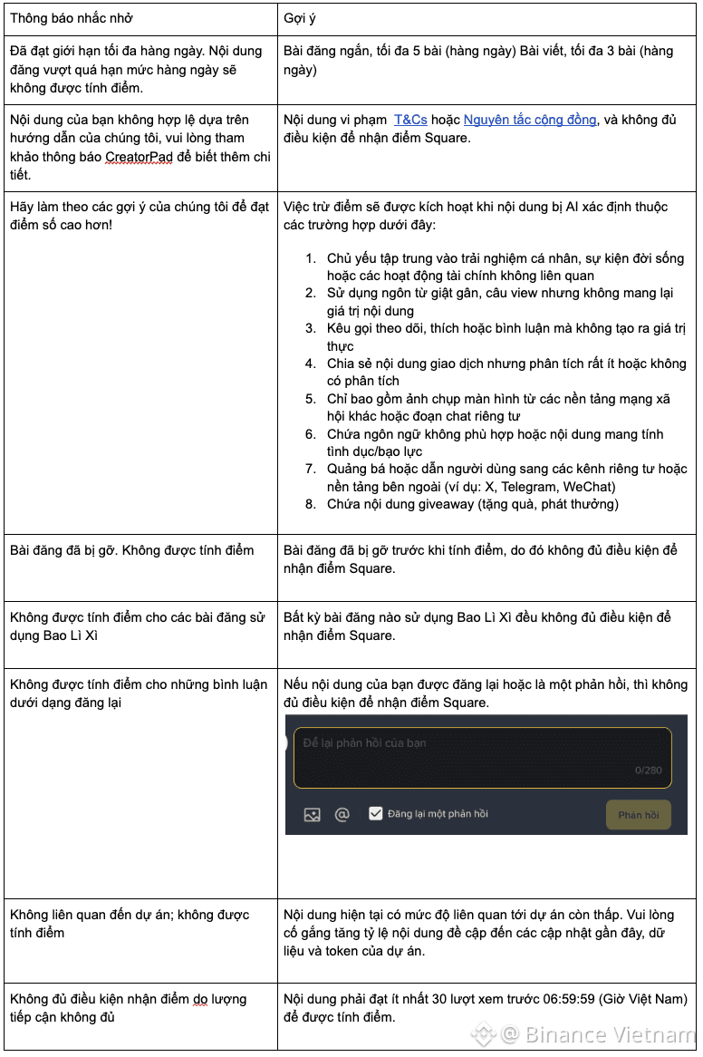 Điểm Square là hệ thống điểm số dùng để xếp hạng các nhà sáng tạo nội dung trên bảng xếp hạng. Để kiếm điểm, bạn có thể hoàn thành các nhiệm vụ trong những chiến dịch dự án khác nhau. Đây là hệ thống chấm điểm được thiết kế nhằm đánh giá hoạt động của người dùng trên Binance Square, từ đó xác định tính hợp lệ và thứ hạng trong các chiến dịch.