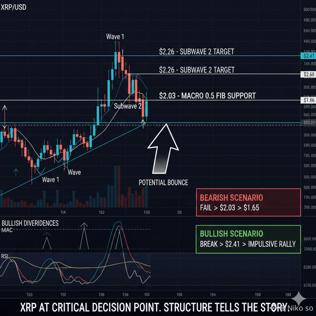 From a wave-structure perspective, the current move appears to be setting up a subwave 2 recovery, with an upside target near $2.26. While this bounce is constructive, it is also a critical decision point for XRP’s next major direction.