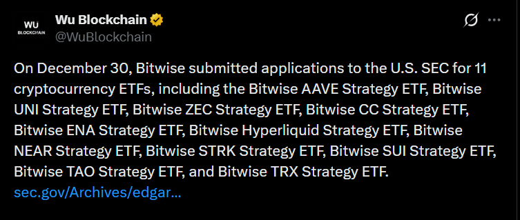 Bitwise Asset Management a déposé une demande auprès de la Commission américaine des valeurs mobilières (SEC) pour l'approbation de 11 nouveaux ETF axés sur les altcoins — et si elle est approuvée, cette initiative pourrait libérer une nouvelle vague de capitaux institutionnels dans le secteur de la cryptomonnaie. Une décision est attendue en mars 2026.