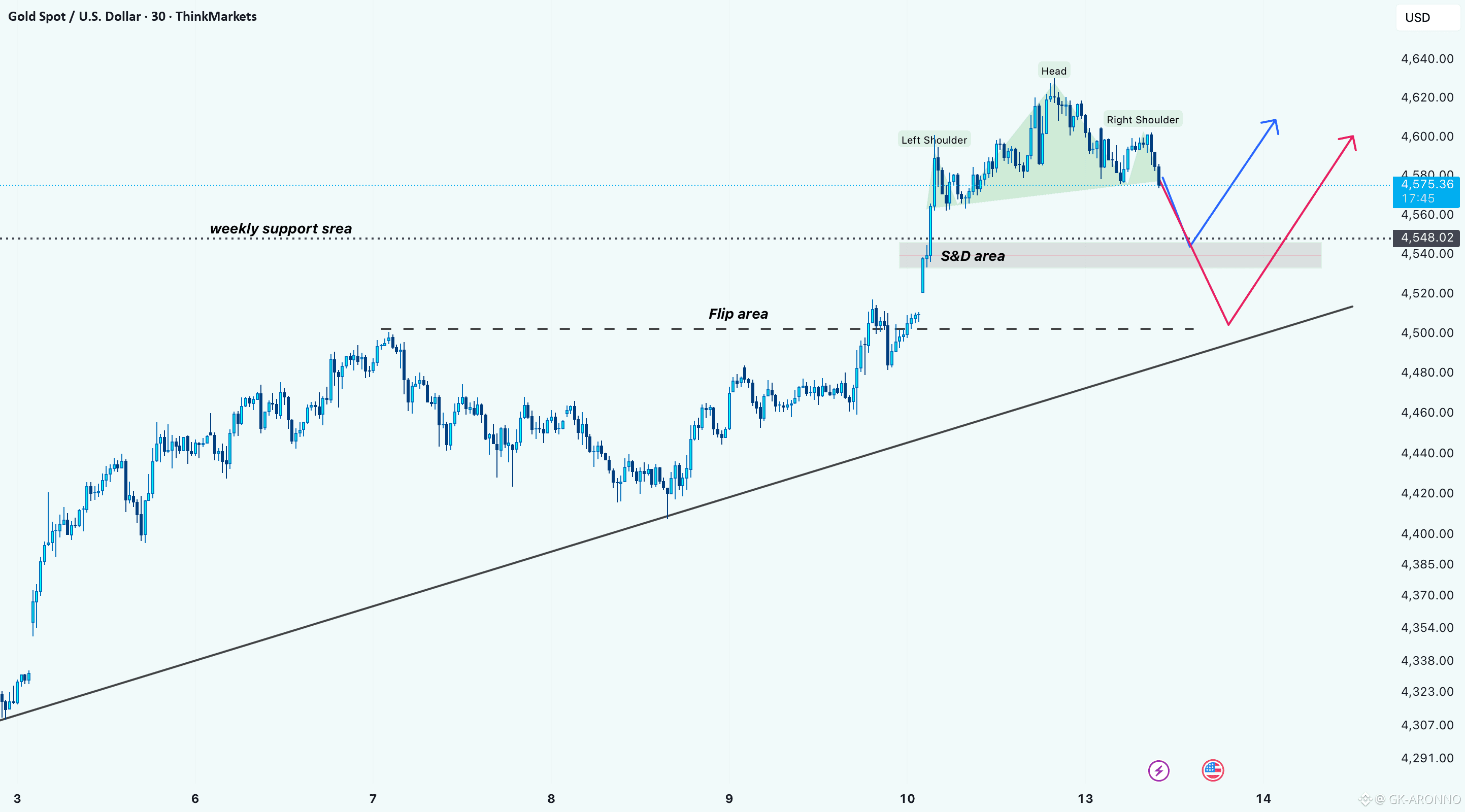 Gold has completed a head and shoulders structure after a strong impulsive move up. Price is now reacting near an important weekly support zone, which also aligns with a local S&D area, a place where buyers are expected to step in.