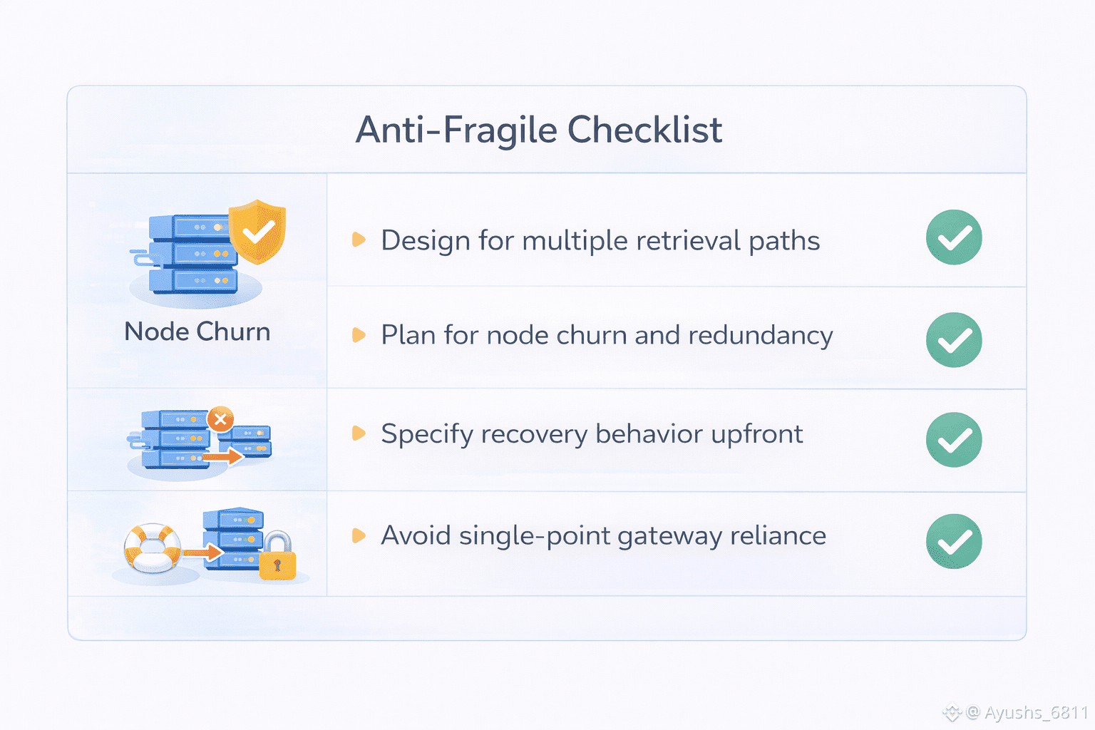 Anti-fragile design starts with accepting two truths. First, node churn is inevitable. Second, your user experience cannot be allowed to fluctuate with it. That means the goal isn’t “avoid churn.” The goal is “make churn irrelevant to users.”