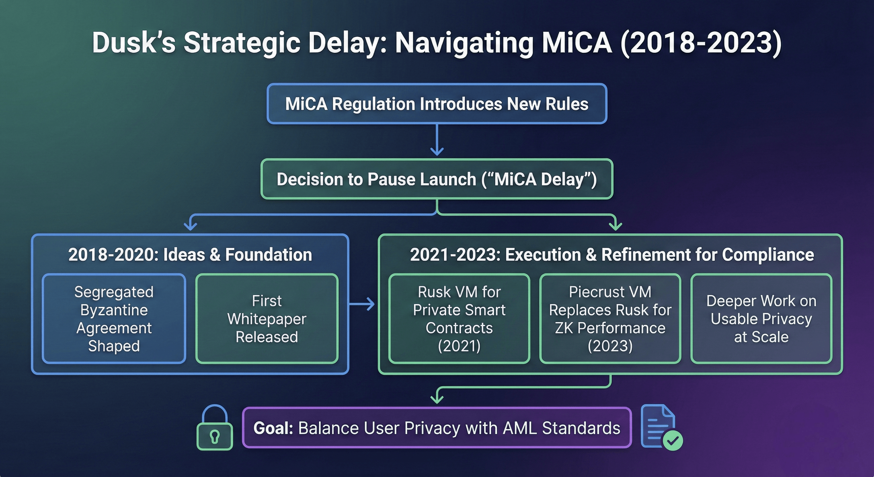 Le parcours de Dusk n'a jamais consisté à se précipiter vers le marché. À l'extérieur, cela pouvait sembler que le projet évoluait lentement, mais à l'intérieur, l'équipe faisait un choix très réfléchi. Le cadre réglementaire européen évoluait, et l'introduction du règlement sur les actifs numériques (MiCA) a changé les règles pour toute blockchain souhaitant servir des cas d'utilisation financiers réels. Au lieu de lancer précipitamment et de corriger les problèmes plus tard, Dusk a choisi d'attendre que le cadre soit clair et que sa technologie puisse fonctionner à l'intérieur de ce cadre sans compromis.