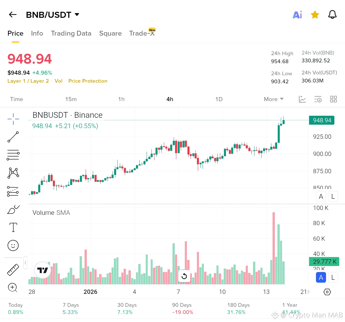 If you've been sleeping on Binance Coin (BNB), it's time to wake up and smell the gains. As we kick off 2026, BNB/USDT is straight-up flexing on the charts, clocking in at a juicy $948.94 with a solid +4.96% pump in the last 24 hours. This isn't just another altcoin wiggle--it's a full-on resurgence that's got traders buzzing from Lahore to LA. Let's dive into this chart like it's the hottest drop of the season and break down why BNB is positioning itself as the king of utility tokens in a post-bull market world.