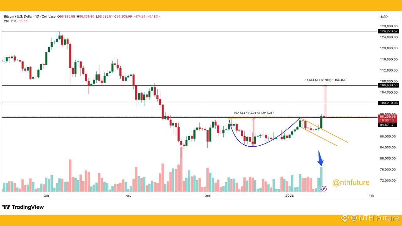 $BTC vừa phá vỡ mô hình cup-and-handle quanh 94,800 USD với khối lượng lớn. Đây là breakout có lực mua thực, không phải do thanh khoản mỏng. Mục tiêu kỹ thuật theo mô hình nằm quanh 106,600 USD, nhưng mốc tâm lý 100,000 USD vẫn là thử thách quan trọng cần chinh phục.