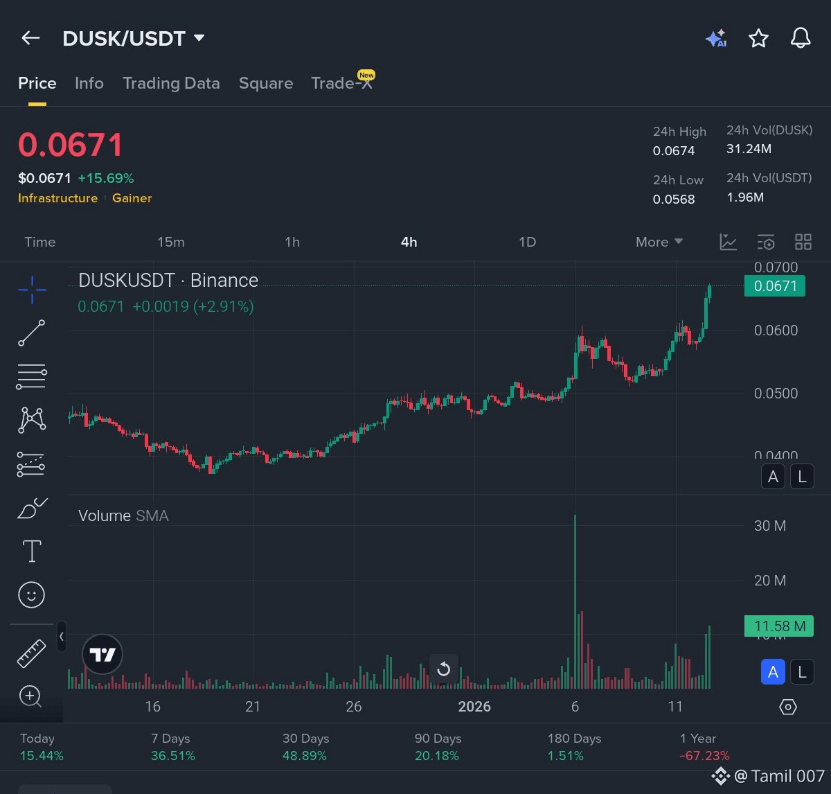 $DUSK is showing serious strength right now! As of today (Jan 12, 2026), the token is trading at around $0.0671 on Binance (DUSK/USDT), marking a solid +15.69% pump in the last 24 hours.