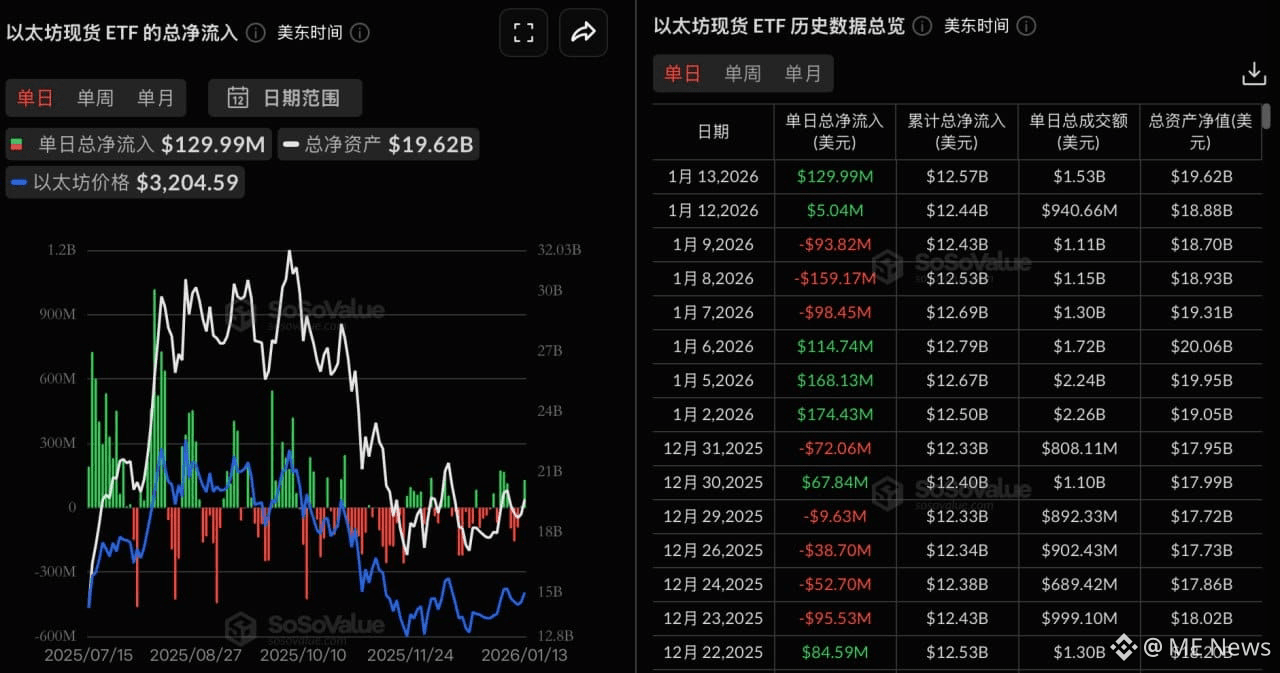 根据 SoSoValue 数据,昨日(美东时间 1 月 13 日)以太坊现货 ETF 总净流入 1.30 亿美元。