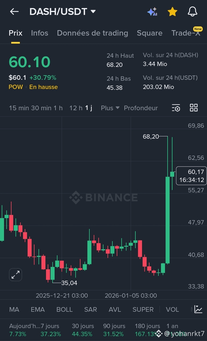 Après une longue période de consolidation, Dash ($DASH) vient de réaliser une performance verticale impressionnante, confirmant son statut de leader parmi les protocoles de paiement décentralisés. Le marché réagit massivement à l'utilité réelle de cette cryptomonnaie historique.