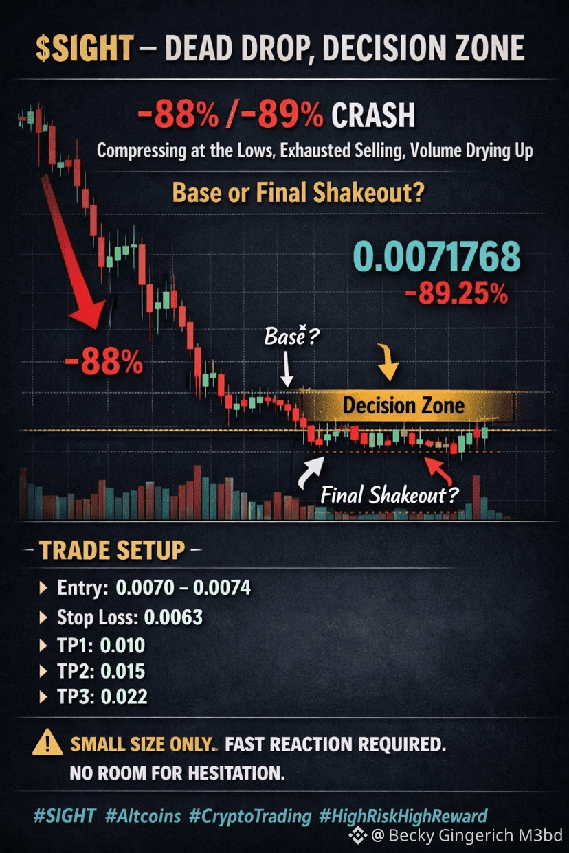 After a brutal -88% to -89% flush, $Sight is now compressing at the lows near 0.0073.
