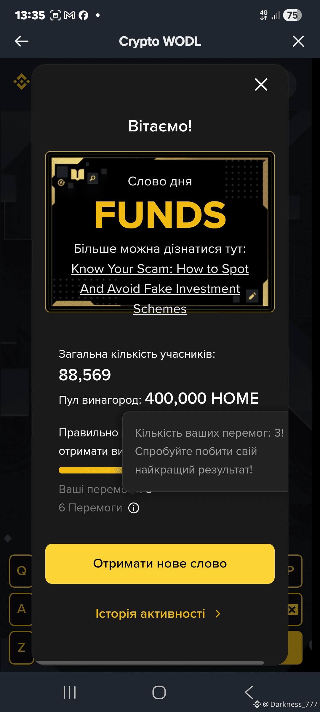 Захист: Сьогодні я вгадав слово дня у WODL — FUNDS (Кошти). Бо безпека — це основа! 🔐✅