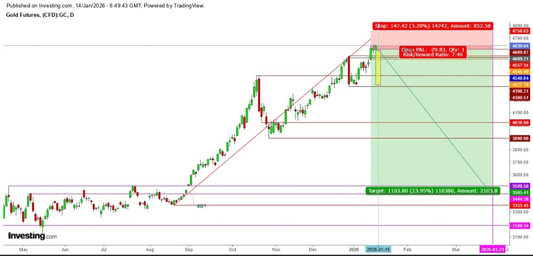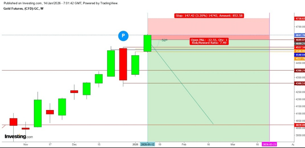 Sur le graphique hebdomadaire, après avoir testé un plus bas de la semaine à 4521,39 dollars et un plus haut de la semaine à 4647,29 dollars, les contrats à terme sur l'or sont actuellement négociés à 4641,15 dollars, ce qui indique une forte impulsion haussière cette semaine, qui pourrait se poursuivre si la Cour suprême reporte à nouveau son jugement imminent sur l'affaire des tarifs commerciaux de Trump.