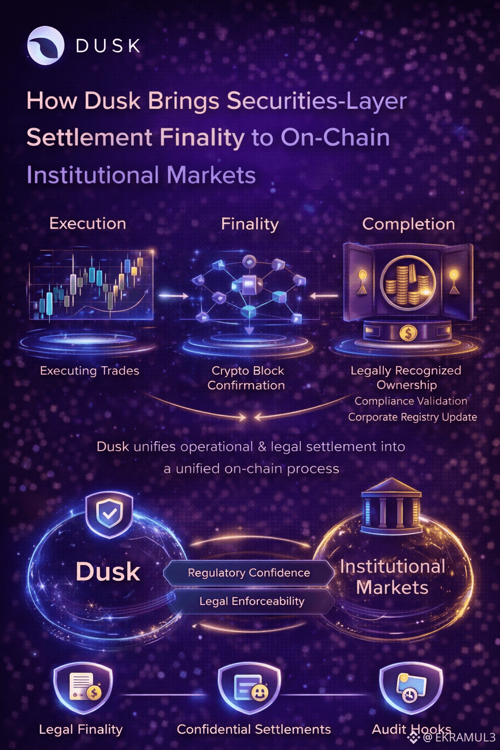 Institutional markets will not migrate to on-chain infrastructure because tokens are novel they will migrate because settlement becomes safer, faster, compliant, and legally consumable. The bridge between crypto finality and securities finality is not a UI problem, it is a protocol problem. Dusk solves it by absorbing the securities layer into the settlement fabric itself, enabling real-world capital markets to exist on-chain without compromise.