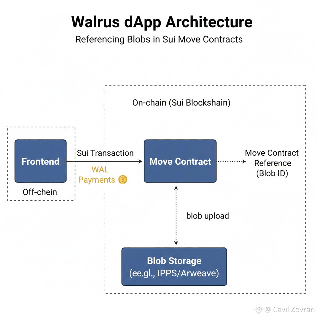 A media dApp on Walrus lets creators upload videos as blobs, paying WAL fees that viewers partially offset via micro-transactions. Smart contracts verify blob certificates before streaming links, while creators stake WAL for priority node assignments. Constraints on metadata size keep transactions efficient. This pattern demonstrates WAL's multi-role utility—payment for storage, staking for performance, and potential subsidies for high-value content—in a functioning ecosystem application.