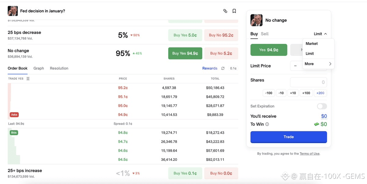 进入某个市场页面,你会看到 Yes/No 两个选项,价格在 0.01-0.99 USDC 之间(代表市场认为的概率)。