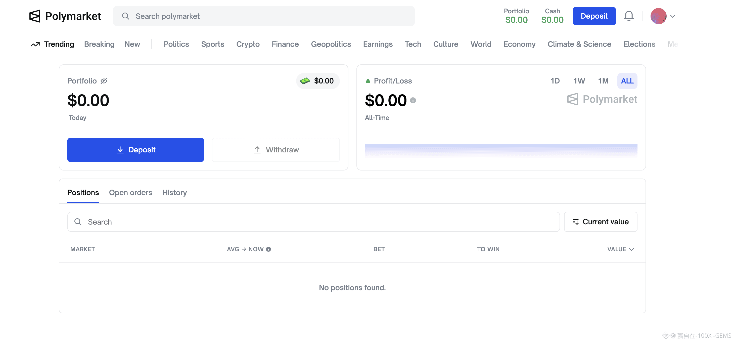 登录后,右上角点击 “Deposit” 或钱包余额处按钮。