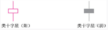 "十字星"的"开盘价"与"收盘价"恰好完全重合,事实上这种精确的巧合并不多见。但确有很多时候,"蜡烛图"在规定的交易时间内其价格在"开盘价"上下经过大幅波动后,"收盘价"又报收在离"开盘价"很近的位置上,最终导致蜡"烛图"的"实体"部分变得很短,而"实体"两端的"影线"却拉得很长("影线"的长度通常都是"实体"长度的2~3倍)。这种具有短小"实体"、近似于"十字星"的"蜡烛图",理所应当地就被称作"类十字星"。根据属性的不同,"类十字星"可以划分为阴、阳两种。