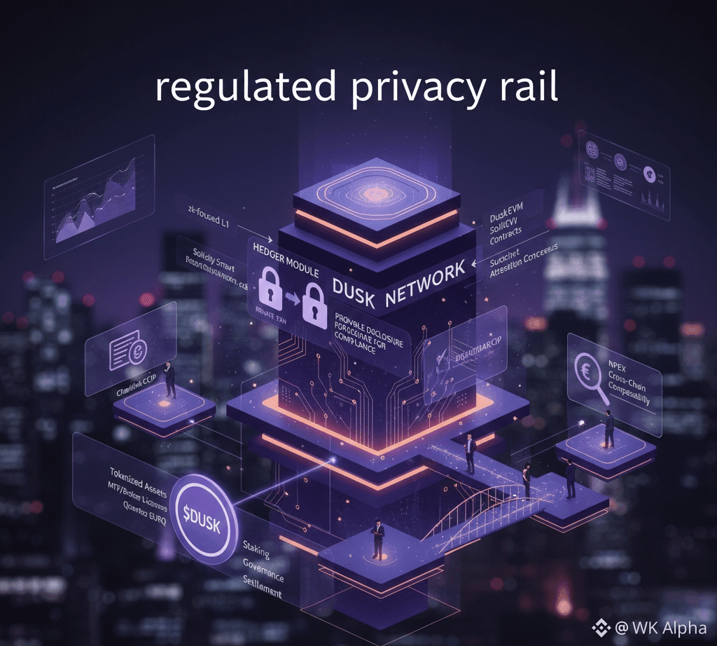 Coffee's hot, lights low after closing out—Dusk's explorer tabs still open. This chain's not chasing retail noise; it's carving regulated privacy rails for finance that actually needs both. On-chain, Dusk runs a zk-focused L1 with DuskEVM for Solidity contracts, Hedger module enabling confidential txs that stay private by default but allow selective, provable disclosure for compliance audits. No blanket anonymity—it's designed for institutions that demand auditability under regs like MiCA. $DUSK stakes secure the network via Succinct Attestation consensus, settles tokenized assets, and drives governance votes.