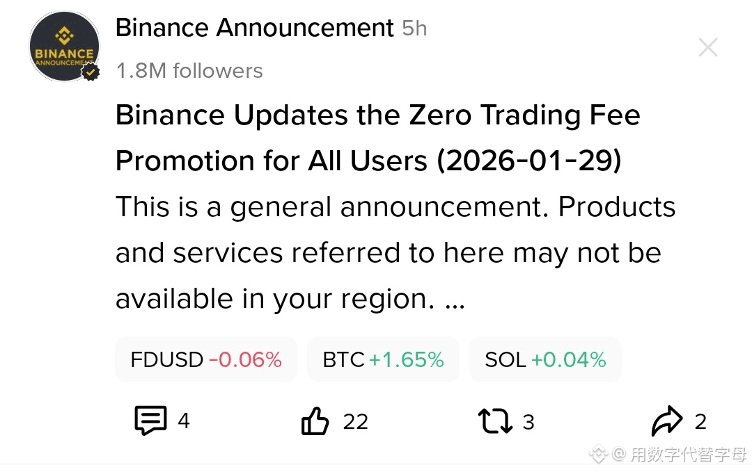 There will be an update to the zero trading fee promotion starting January 29, 2026, at 00:00 UTC.