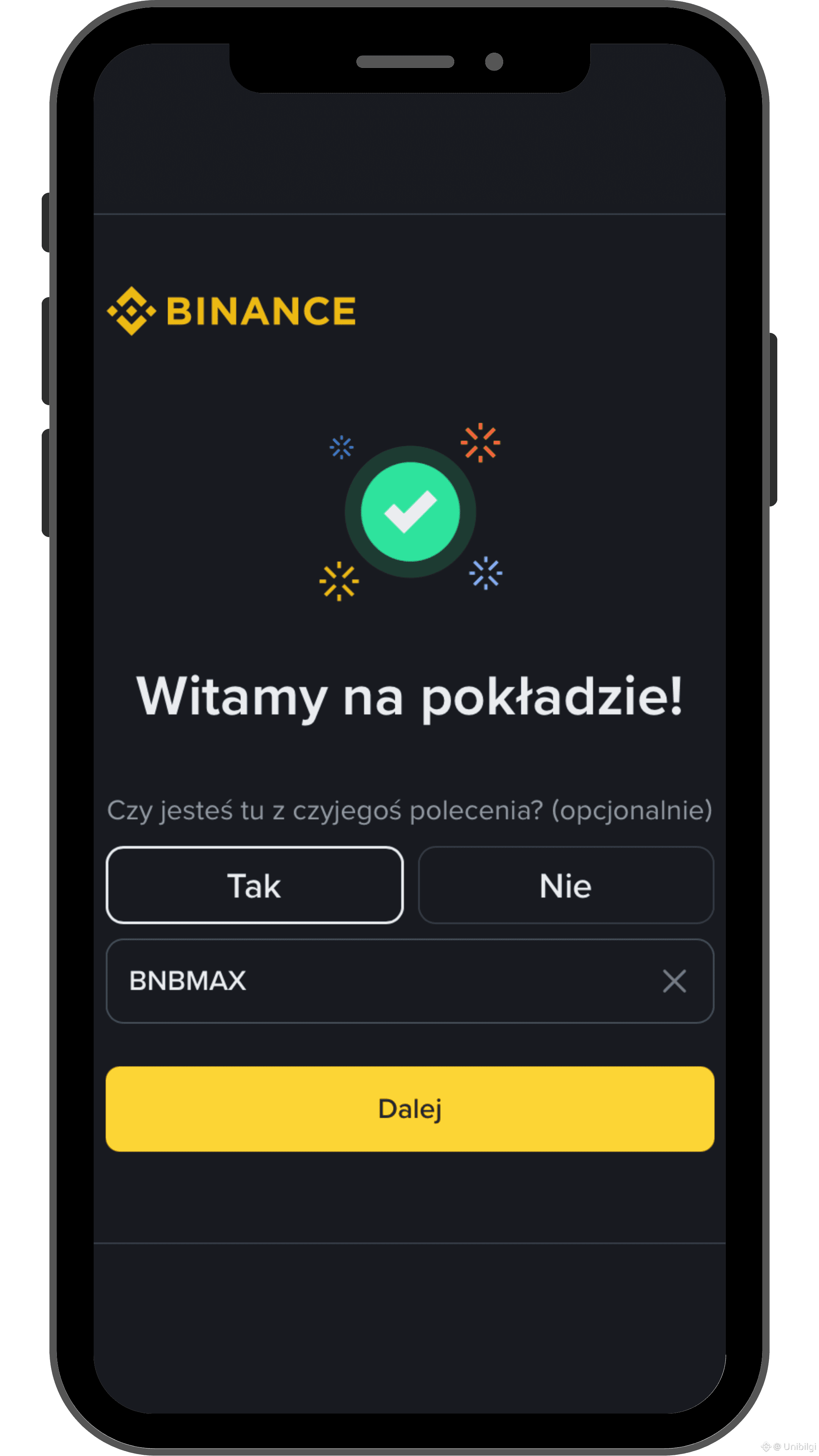 Podczas rejestracji wpisz BNBMAX w polu ID polecającego. Następnie podaj e-mail lub numer telefonu i przejdź weryfikację tożsamości. Po jej zakończeniu Centrum Nagród stanie się dostępne, a bonusy pojawią się automatycznie po spełnieniu warunków, takich jak pierwsza transakcja.