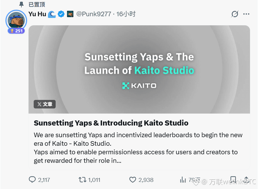 业务层面: Kaito 创始人 Yu Hu 被迫宣布终止 Yaps 业务,并转型为传统的营销平台 Kaito Studio。