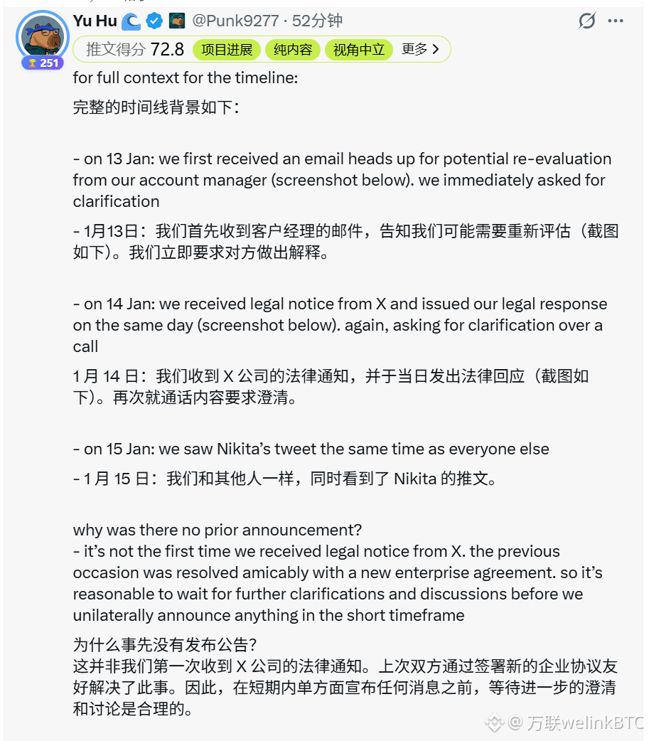 在消息公布后,创始人 Yu Hu 也承认曾与 X 方面沟通。这意味着你还在通宵发推撸分时,团队早已心知肚明,并提前完成了高位减持。