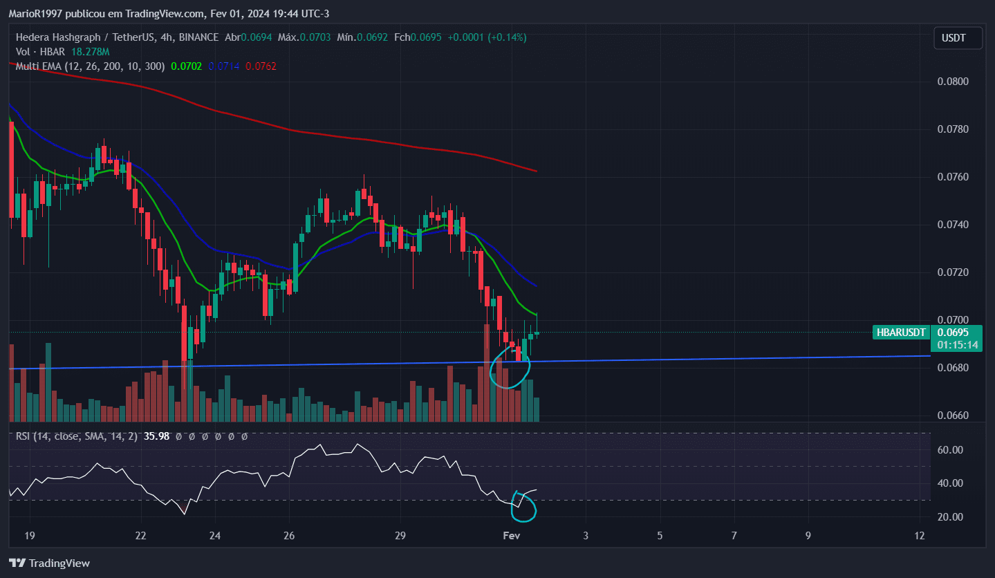Sur le graphique hebdomadaire (1W) de HBAR $HBAR , nous pouvons observer le motif « Tasse et Poignée ». Actuellement, nous sommes déjà dans la poignée de la tasse ("Handle"), et le graphique à 4 heures (4H) a également touché le niveau de survente du RSI, suggérant que ce pourrait être notre point de support actuel, confirmant le fond de la poignée de la tasse.