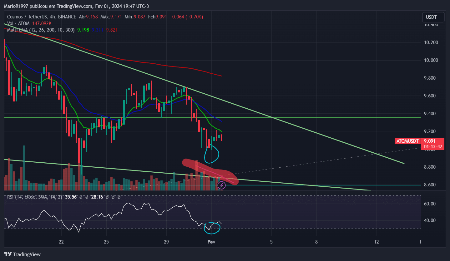 ATOM $ATOM est également en formation de triangle baissier sur le graphique à 4 heures (4H) et a atteint le niveau de survente du RSI, tout comme la cryptomonnaie $PERP, et le volume diminue, ce qui indique une fatigue de la force vendeuse. Ces deux éléments pourraient indiquer un support pour les acheteurs.