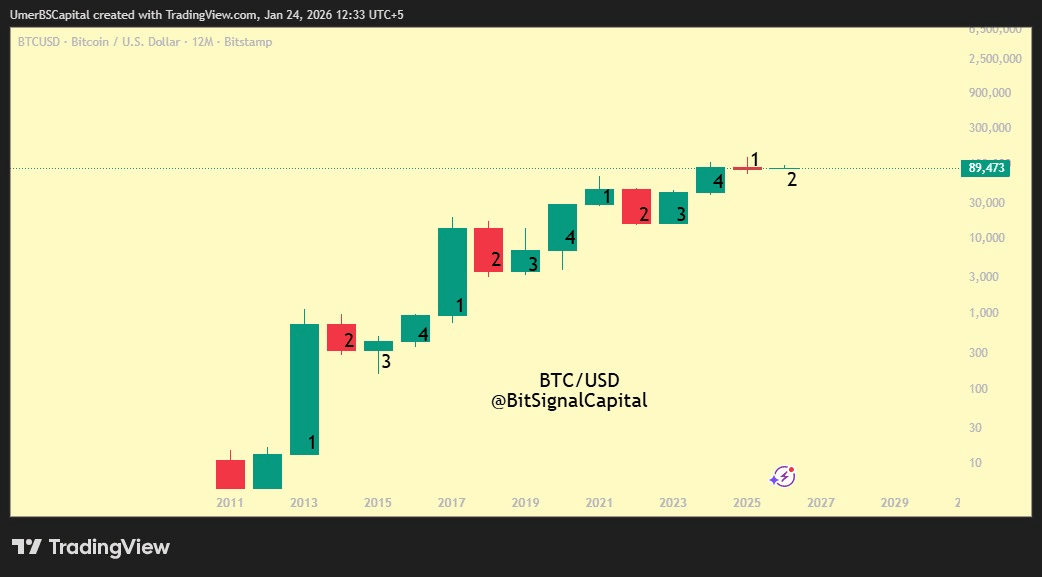 En regardant les cycles passés, 2025 correspond statistiquement au sommet d'un marché haussier, tandis que 2026 a historiquement agi comme l'année de marché baissier du Bitcoin. Cela ne signifie pas toujours un crash brutal — plus souvent, cela reflète une période prolongée de sommets plus bas, de momentum décroissant et de rotation du capital.