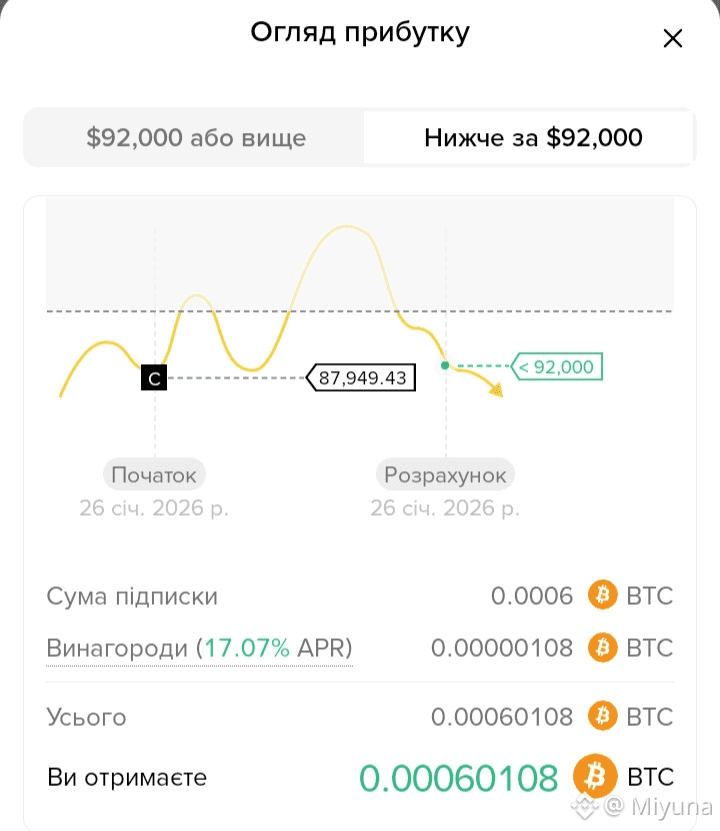 Поки ціна на $BTC відмовляється рости, я вирішила спробувати опцію "Подвійні інвестиції". Вибрала найкоротший проміжок - 4 дні. Цільова сума - 92000. Я обрала продаж. На купівлю все працює за такою ж схемою.