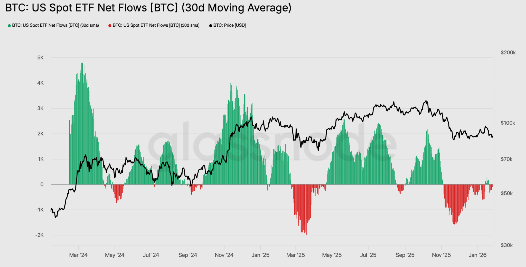 Flux nets d'ETF Bitcoin au comptant, 30DMA. Source : Glassnode