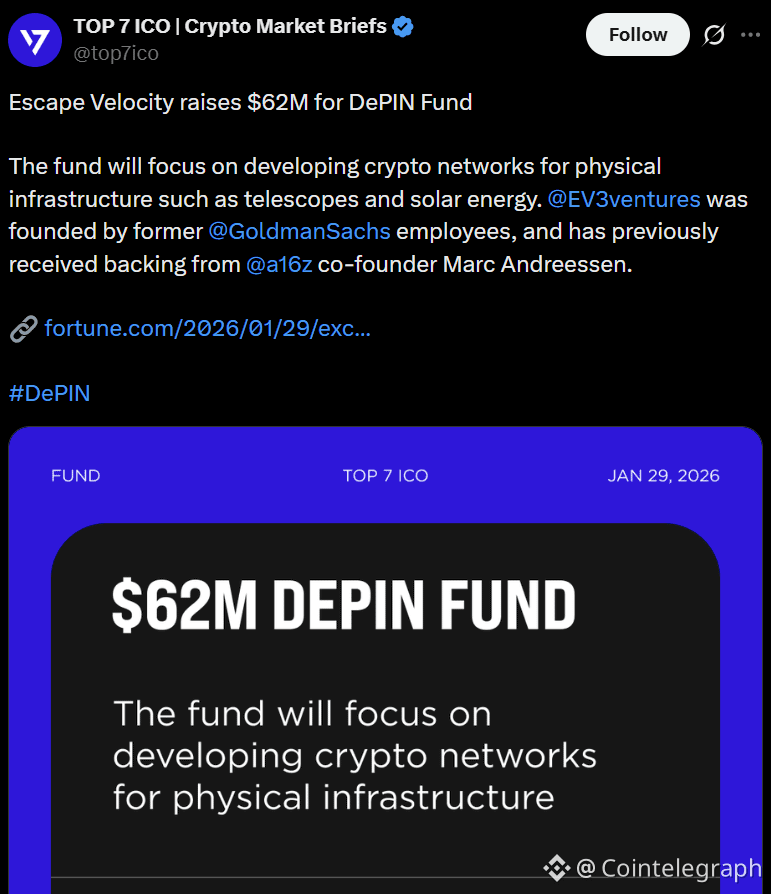 Crypto-focused venture capital firm Escape Velocity has raised nearly $62 million to invest in decentralized physical infrastructure network (DePIN) projects, signaling continued venture interest in the sector despite a broader slowdown in crypto and technology funding.