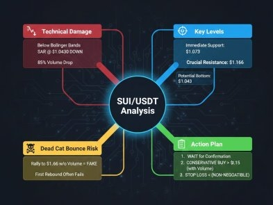 $SUI/USDT : Le résumé de l'analyse de la dernière résistance à $1.073-$1.166 : La baisse de SUI à $1.1204 reflète des dommages techniques sévères, le prix étant désormais négocié en dessous de tous les niveaux clés de Bollinger et le SAR pointant vers le bas à $1.0430. Ce qui est le plus préoccupant, c'est la baisse de 85 % du volume — un signe d'intérêt perdu ou d'accumulation en sourdine. Le bas de $1.073 est le support immédiat ; une rupture ici ouvre la voie à $1.043. Le risque de rebond de chat mort : Tout rallye vers $1.166 sans une augmentation significative du volume est susceptible d'être un rebond éphémère — un "rebond de chat mort" qui piége les traders haussiers avant de reprendre la tendance à la baisse. Dans les marchés faibles, le premier rebond échoue souvent. Plan d'action clair : · Attendre la confirmation : rupture au-dessus de $1.166 ou en dessous de $1.073 · Entrée conservatrice : seulement au-dessus de $1.15 avec confirmation de volume · Arrêt non négociable : en dessous de $1.07 pour toute tentative longue. Moment de décision : SUI peut-il se stabiliser au-dessus de $1.073 et construire une base, ou va-t-il s'effondrer vers $1.04 ? Temps de décider. #ByX IMPACT Leaederboard $SUIUSDT