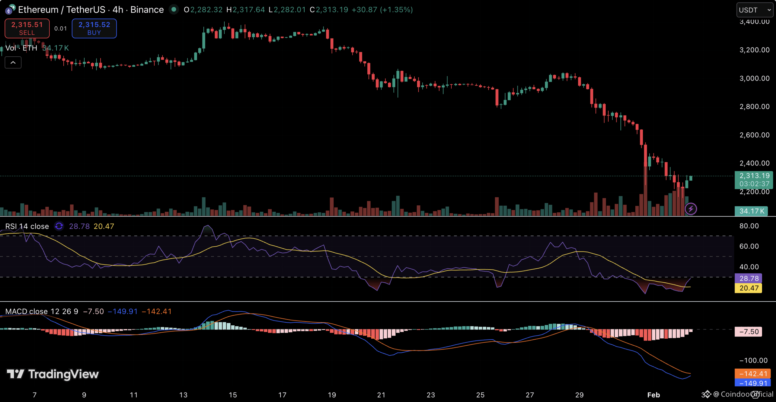From a technical perspective, ETH is still stabilizing after a sharp correction. On the 4-hour chart, RSI remains below the neutral 50 level, indicating that momentum is weak but no longer deeply oversold. MACD is still negative, though the histogram shows early signs of downside momentum slowing, suggesting selling pressure may be exhausting.